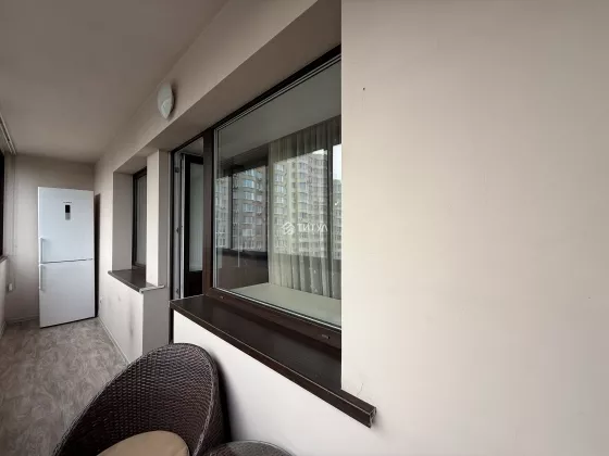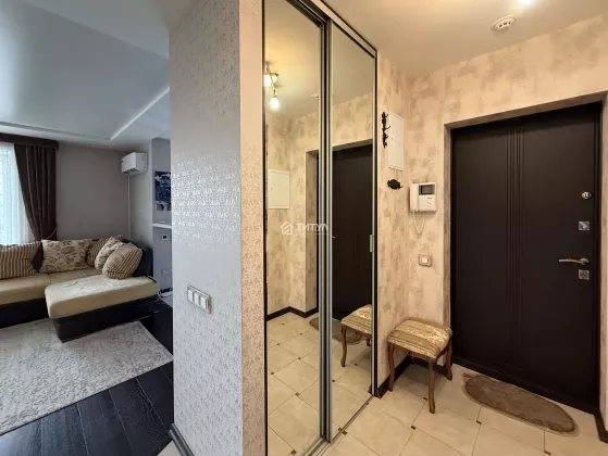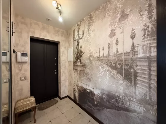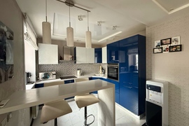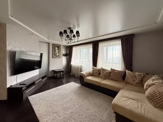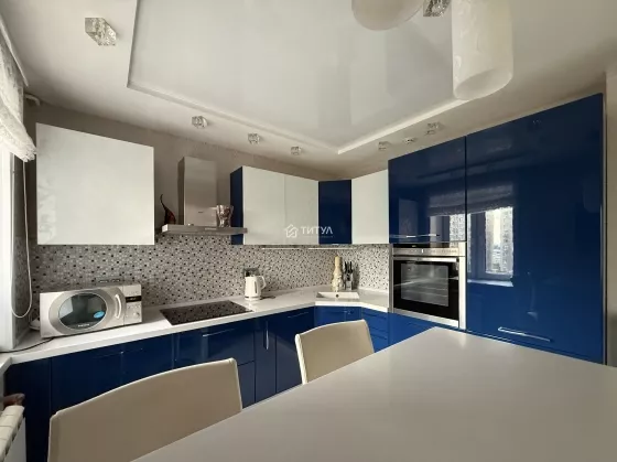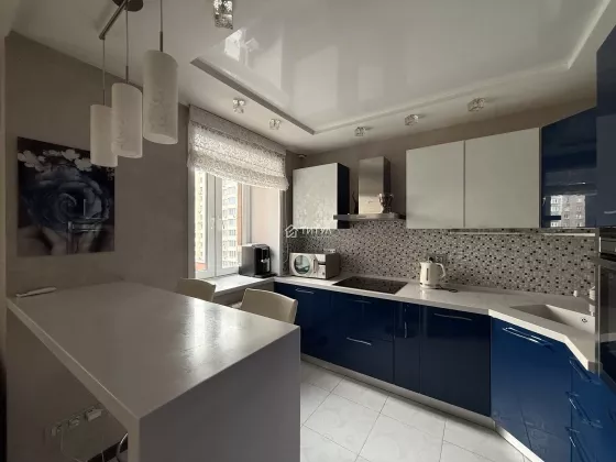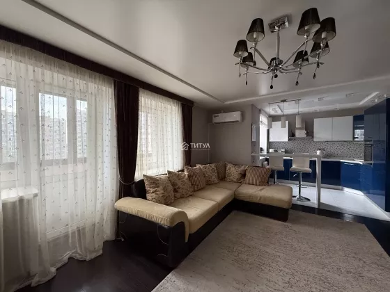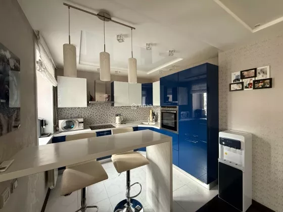 Квартира красивая, в хорошем состоянии. Отделка сделана со вкусом и с душой. В кухне рисунок фасадов перекликается с рисунком занавесок и плафонов. Кухонный гарнитур с качественной импортной фурнитурой, вращающейся полкой в нижнем угловом отделении и встроенной немецкой бытовой техникой (холодильник, посудомоечная машина, вытяжка, варочная панель, духовой шкаф). В квартире предусмотрено несколько уровней света, в том числе точечное освещение. Установлены кондиционер и водонагреватель. На балконе расположены кресла и кофейный столик. Так же организовано дополнительное место хранения. Установлены датчики охранной сигнализации.